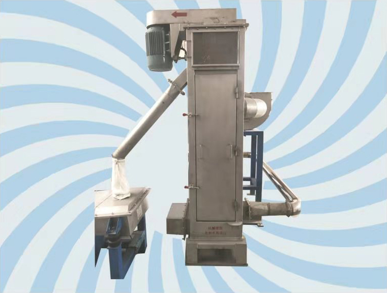 干燥机是将塑料粒子与水分离的一种设备。粒子和水进入干燥机在离心力的作用下,粒子以高速、螺旋的形式向上输送。在向上输送的过程中,粒子表面水分与粒子进行分离,干燥室上部通风机产生的气流与粒子逆向运动,加速粒子表面水分与粒子进一步分离,完成气流干燥过程。潮湿空气由通风机经出风管排入大气,分离出来的水由出水口排出,粒子得到充分干燥后经出料斗排出。